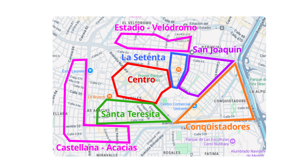 Ce quartier est sous-estimé. Idéalement situé entre Laureles et l’autoroute, il permet de rejoindre Provenza en seulement 10 minutes hors des heures de pointe, tout en étant à 5 minutes en Uber ou 25 minutes à pied du centre de Laureles.